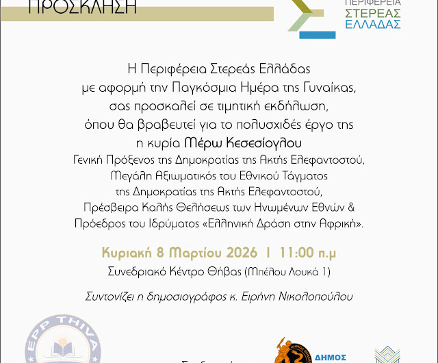 Η Περιφέρεια Στερεάς Ελλάδας τιμά την Παγκόσμια Ημέρα της Γυναίκας με μια ξεχωριστή εκδήλωση που θα πραγματοποιηθεί...
