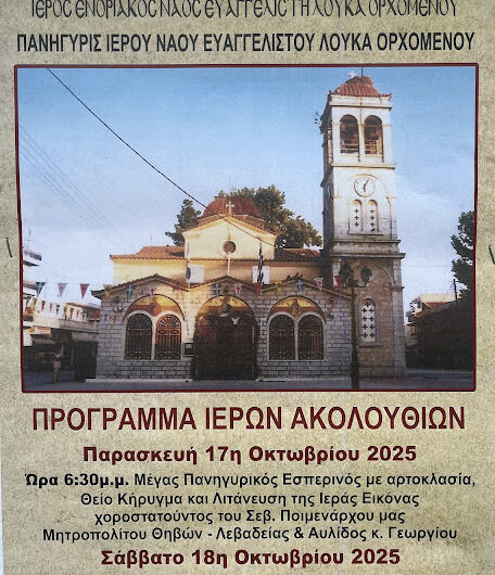 Η Ιερά Μητρόπολη Θηβών, Λεβαδείας και Αυλίδος ανακοινώνει ότι την Παρασκευή 17 και το Σάββατο 18 Οκτωβρίου...