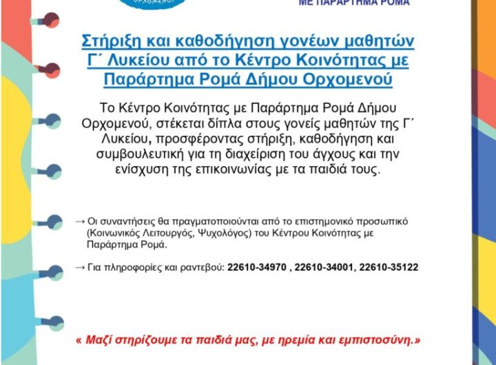 Το Κέντρο Κοινότητας με Παράρτημα Ρομά Δήμου Ορχομενού, στέκεται δίπλα στους γονείς μαθητών της Γ΄ Λυκείου, προσφέροντας...
