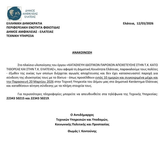 Ο Δήμος Δελφών, σε συνέχεια παρέμβασης του επικεφαλής της παράταξης Ανανεωτική Δύναμη, κ. Μαρίνου Λύτρα, στην οποία...