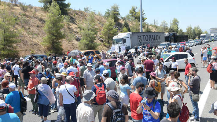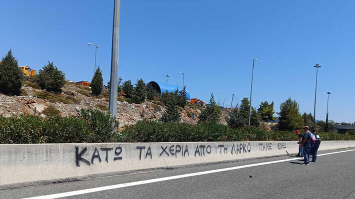 «Κάτω τα χέρια από τη ΛΑΡΚΟ» είναι το σύνθημα που έγραψαν μέλη σωματείων στο διαχωριστικό στηθαίο της...