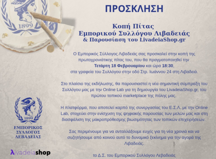 Ο Εμπορικός Σύλλογος Λιβαδειάς θα κόψει την πρωτοχρονιάτικη πίτα, στα γραφεία του, την Τετάρτη 18 Φεβρουαρίου στις...