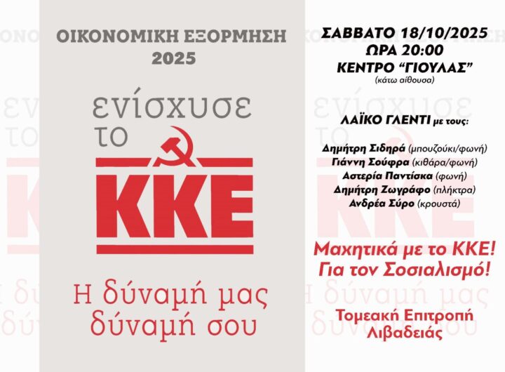 Η Κ.Ο. Λιβαδειάς του ΚΚΕ σας καλεί σε συνεστίαση-λαϊκό γλέντι με τους Δημήτρη Σιδηρά, Γιάννη Σούφρα, Αστερία...