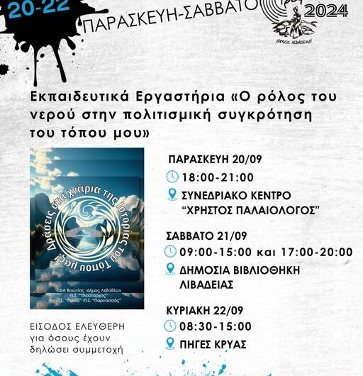 Παρασκευή 20 έως και Κυριακή 22 Σεπτεμβρίου…Εκπαιδευτικά Εργαστήρια Τοπικής Ιστορίας του Δήμου Λεβαδέων “Ο ρόλος του νερού...
