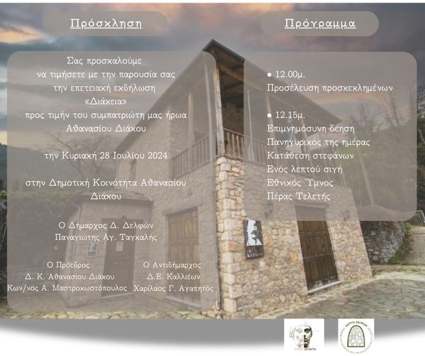 Ο Δήμος Δελφών και η Δημοτική Κοινότητα Αθανασίου Διάκου διοργανώνουν, την Κυριακή 28 Ιουλίου 2024, την επετειακή...