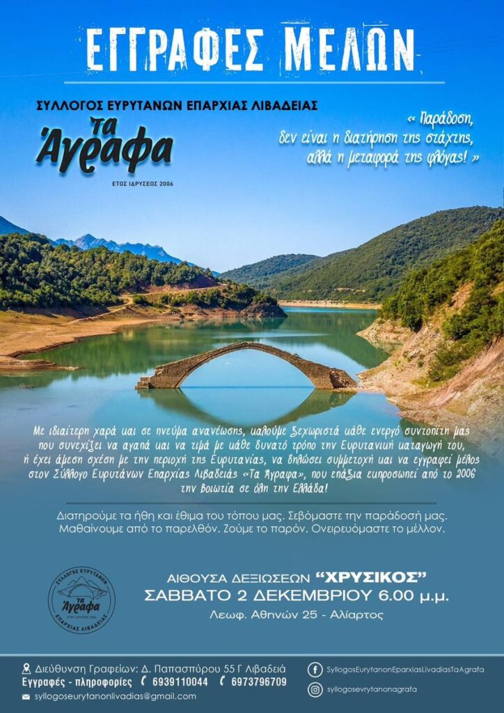 Με ιδιαίτερη χαρά και σε πνεύμα ανανέωσης, καλούμε ξεχωριστά κάθε ενεργό συντοπίτη μας που συνεχίζει να αγαπά και να τιμά με κάθε δυνατό τρόπο την Ευρυτανική καταγωγή του, ή έχει άμεση σχέση με την περιοχή της Ευρυτανίας, να δηλώσει συμμετοχή και να εγγραφεί μέλος στον Σύλλογο Ευρυτάνων Επαρχίας Λιβαδειάς «Τα Άγραφα», που επάξια εκπροσωπεί από το 2006 την Βοιωτία σε όλη την Ελλάδα!