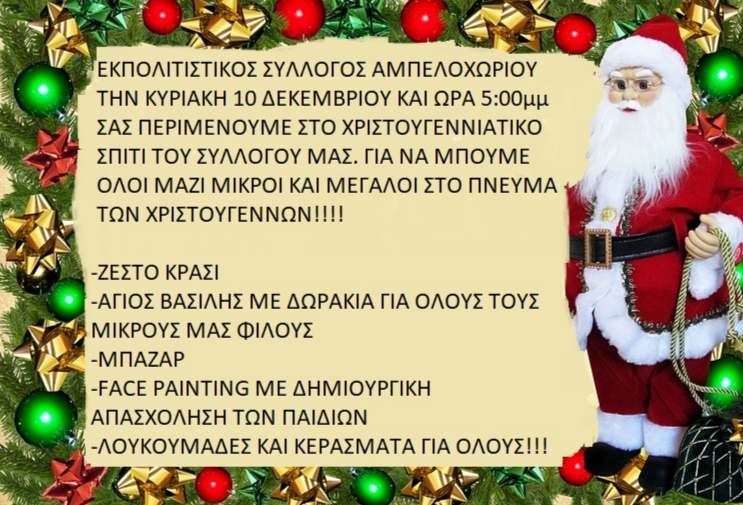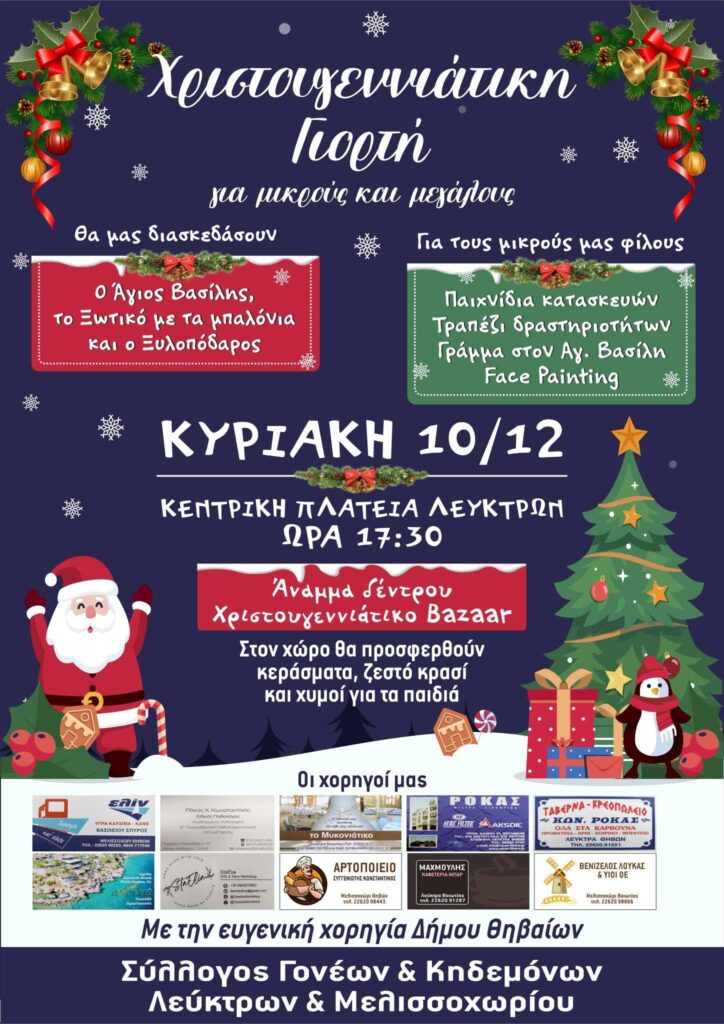 Ε͟κ͟δ͟η͟λ͟ώ͟σ͟ε͟ι͟ς͟ Eκδηλώσεις στο Αμπελοχώρι & στα Λεύκτρα admin 8 Δεκεμβρίου, 2023 Πρόσκληση Εκπολιτιστικού Συλλόγου Αμπελοχωρίου Πρόσκληση στη Χριστουγεννιάτικη γιορτή Λεύκτρων Tags: Αμπελοχώρι Δήμος Θηβαίων ΘΗΒΑ Λέυκτρα Χριστουγεννιάτικες εκδηλώσεις Post navigation Previous #τοσκίτσοNext Διαμαρτυρία για τα γήπεδα οι αστυνομικοί της Φωκίδας Αφήστε μια απάντηση Ακύρωση απάντησηςΗ ηλ. διεύθυνση σας δεν δημοσιεύεται. Τα υποχρεωτικά πεδία σημειώνονται με *Σχόλιο * Όνομα * Email * Ιστότοπος Αποθήκευσε το όνομά μου, email, και τον ιστότοπο μου σε αυτόν τον πλοηγό για την επόμενη φορά που θα σχολιάσω. Related Stories Ο Όμιλος Φίλων Θεάτρου Λιβαδειάς ανεβάζει την παράσταση “Εχθροί εξ Αίματος” του Αρκά Ε͟κ͟δ͟η͟λ͟ώ͟σ͟ε͟ι͟ς͟ Ο Όμιλος Φίλων Θεάτρου Λιβαδειάς ανεβάζει την παράσταση “Εχθροί εξ Αίματος” του Αρκά 15 Απριλίου, 2026 Ο Πολιτιστικός Σύλλογος Αρκίτσας ” Ο Κλείδωνας” αναβίωσε το έθιμο της «Ρωμάνας» Ε͟κ͟δ͟η͟λ͟ώ͟σ͟ε͟ι͟ς͟ Ο Πολιτιστικός Σύλλογος Αρκίτσας ” Ο Κλείδωνας” αναβίωσε το έθιμο της «Ρωμάνας» 14 Απριλίου, 2026 ➡️ Μια ξεχωριστή βραδιά γεμάτη εθελοντισμό, αλληλεγγύη και κοινωνική προσφορά, την Τετάρτη στις 20:00 στον Πολυχώρο Πολιτισμού! Ε͟κ͟δ͟η͟λ͟ώ͟σ͟ε͟ι͟ς͟ ➡️ Μια ξεχωριστή βραδιά γεμάτη εθελοντισμό, αλληλεγγύη και κοινωνική προσφορά, την Τετάρτη στις 20:00 στον Πολυχώρο Πολιτισμού! 14 Απριλίου, 2026