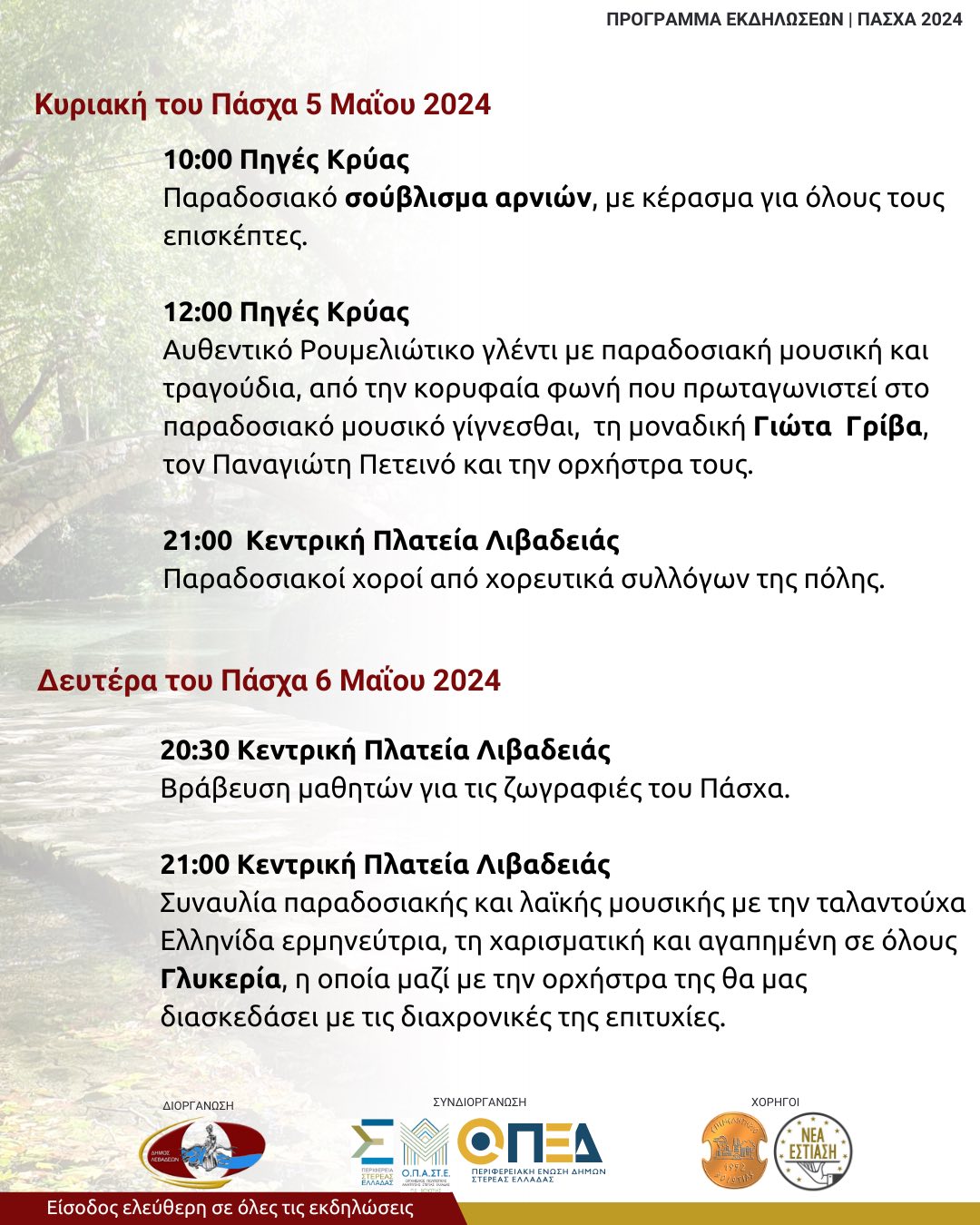 Φέτος την Κυριακή του Πάσχα το πρωί ο Δήμος Λεβαδέων σας προσκαλεί στο ιδανικότερο σημείο της πόλης, τις πηγές της Κρύας, όπου θα έχει στηθεί ένας μεγάλος λάκκος. Σε αυτή τη Λιβαδείτικη ιεροτελεστία θα μας κρατήσει συντροφιά η εξαιρετική Γιώτα Γρίβα η οποία πρωταγωνιστεί στο παραδοσιακό μουσικό γίγνεσθαι.