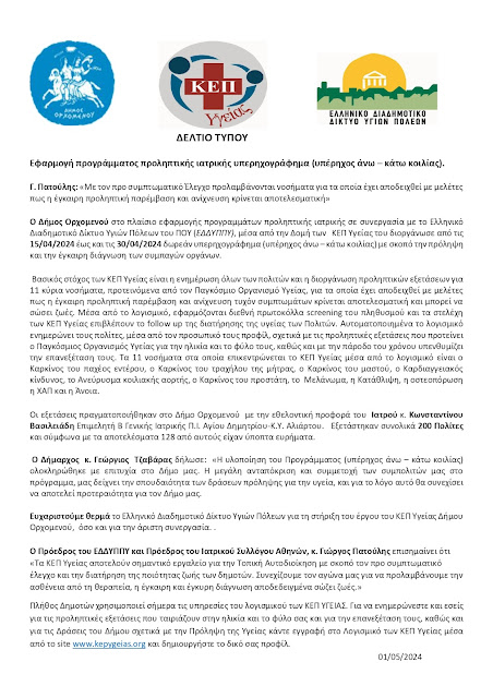 O Δήμος Ορχομενού στο πλαίσιο εφαρμογής προγραμμάτων προληπτικής ιατρικής σε συνεργασία με το Ελληνικό Διαδημοτικό Δίκτυο Υγιών Πόλεων του ΠΟΥ (ΕΔΔΥΠΠΥ), μέσα από την Δομή των ΚΕΠ Υγείας του διοργάνωσε από τις 15/04/2024 έως και τις 30/04/2024 δωρεάν υπερηχογράφημα (υπέρηχος άνω – κάτω κοιλίας) με σκοπό την πρόληψη και την έγκαιρη διάγνωση των συμπαγών οργάνων.