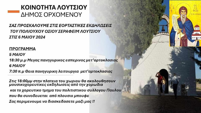 Ε͟κ͟δ͟η͟λ͟ώ͟σ͟ε͟ι͟ς͟ Εορταστικές εκδηλώσεις στη Δημοτική Κοινότητα Λουτσίου admin 5 Μαΐου, 2024 Tags: Δημοτική Κοινότητα Λούτσι Post navigation Previous Χριστός Ανέστη!Next Κάλεσμα από το Ακραίφνιο Αφήστε μια απάντηση Ακύρωση απάντησηςΗ ηλ. διεύθυνση σας δεν δημοσιεύεται. Τα υποχρεωτικά πεδία σημειώνονται με *Σχόλιο * Όνομα * Email * Ιστότοπος Αποθήκευσε το όνομά μου, email, και τον ιστότοπο μου σε αυτόν τον πλοηγό για την επόμενη φορά που θα σχολιάσω. Related Stories Ο Όμιλος Φίλων Θεάτρου Λιβαδειάς ανεβάζει την παράσταση “Εχθροί εξ Αίματος” του Αρκά Ε͟κ͟δ͟η͟λ͟ώ͟σ͟ε͟ι͟ς͟ Ο Όμιλος Φίλων Θεάτρου Λιβαδειάς ανεβάζει την παράσταση “Εχθροί εξ Αίματος” του Αρκά 15 Απριλίου, 2026 Ο Πολιτιστικός Σύλλογος Αρκίτσας ” Ο Κλείδωνας” αναβίωσε το έθιμο της «Ρωμάνας» Ε͟κ͟δ͟η͟λ͟ώ͟σ͟ε͟ι͟ς͟ Ο Πολιτιστικός Σύλλογος Αρκίτσας ” Ο Κλείδωνας” αναβίωσε το έθιμο της «Ρωμάνας» 14 Απριλίου, 2026 ➡️ Μια ξεχωριστή βραδιά γεμάτη εθελοντισμό, αλληλεγγύη και κοινωνική προσφορά, την Τετάρτη στις 20:00 στον Πολυχώρο Πολιτισμού! Ε͟κ͟δ͟η͟λ͟ώ͟σ͟ε͟ι͟ς͟ ➡️ Μια ξεχωριστή βραδιά γεμάτη εθελοντισμό, αλληλεγγύη και κοινωνική προσφορά, την Τετάρτη στις 20:00 στον Πολυχώρο Πολιτισμού! 14 Απριλίου, 2026