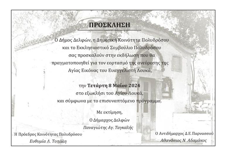 Ο Δήμος Δελφών, η Δημοτική Κοινότητα Πολυδρόσου και το Εκκλησιαστικό Συμβούλιο Πολυδρόσου προσκαλούν στη εκδήλωση για τον εορτασμό της ανεύρεσης της Αγίας Εικόνας του Ευαγγελιστή Λουκά, η οποία θα πραγματοποιηθεί την Τετάρτη 8 Μαϊου 2024, στο εξωκλήσι του Αγίου Λουκά.