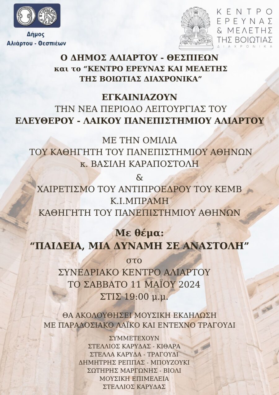 Ε͟κ͟δ͟η͟λ͟ώ͟σ͟ε͟ι͟ς͟ Το “Ελεύθερο-Λαϊκό Πανεπιστήμιο Αλιάρτου” εγκαινιάζει admin 8 Μαΐου, 2024 Το “Ελεύθερο-Λαϊκό Πανεπιστήμιο Αλιάρτου” εγκαινιάζει τη νέα περίοδο λειτουργίας του με εκδήλωση που θα πραγματοποιηθεί το Σάββατο 11 Μαϊου με το ακόλουθο πρόγραμμα: Tags: Eλέυθερο Λαικό Πανεπιστήμιο Αλιάρτου Post navigation Previous Εορτή Αγίου Γεωργίου – Ονομαστήρια ΣεβασμιωτάτουNext Πάσχα 2024 στην Ιερά Μονή Ευαγγελιστρίας Αλιάρτου Αφήστε μια απάντηση Ακύρωση απάντησηςΗ ηλ. διεύθυνση σας δεν δημοσιεύεται. Τα υποχρεωτικά πεδία σημειώνονται με *Σχόλιο * Όνομα * Email * Ιστότοπος Αποθήκευσε το όνομά μου, email, και τον ιστότοπο μου σε αυτόν τον πλοηγό για την επόμενη φορά που θα σχολιάσω. Related Stories Δράση πρόληψης και προαγωγής υγείας στη Δωρίδα με τους «Γιατρούς του Κόσμου» Ε͟κ͟δ͟η͟λ͟ώ͟σ͟ε͟ι͟ς͟ Δράση πρόληψης και προαγωγής υγείας στη Δωρίδα με τους «Γιατρούς του Κόσμου» 16 Απριλίου, 2026 Ο Όμιλος Φίλων Θεάτρου Λιβαδειάς ανεβάζει την παράσταση “Εχθροί εξ Αίματος” του Αρκά Ε͟κ͟δ͟η͟λ͟ώ͟σ͟ε͟ι͟ς͟ Ο Όμιλος Φίλων Θεάτρου Λιβαδειάς ανεβάζει την παράσταση “Εχθροί εξ Αίματος” του Αρκά 15 Απριλίου, 2026 Ο Πολιτιστικός Σύλλογος Αρκίτσας ” Ο Κλείδωνας” αναβίωσε το έθιμο της «Ρωμάνας» Ε͟κ͟δ͟η͟λ͟ώ͟σ͟ε͟ι͟ς͟ Ο Πολιτιστικός Σύλλογος Αρκίτσας ” Ο Κλείδωνας” αναβίωσε το έθιμο της «Ρωμάνας» 14 Απριλίου, 2026