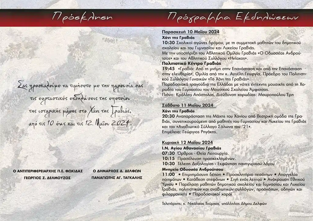 𝔰𝔱𝔢𝔯𝔢𝔞 Ε͟κ͟δ͟η͟λ͟ώ͟σ͟ε͟ι͟ς͟ Eκδηλώσεις για τη μάχη στο Χάνι της Γραβιάς admin 8 Μαΐου, 2024 Tags: Δήμος Δελφών Post navigation Previous Έκθεση PABLO PICASSONext Εντυπωσίασε το Ρουμελιώτικο Πάσχα στη Λιβαδειά(𝒱𝒾𝒹𝑒𝑜) Αφήστε μια απάντηση Ακύρωση απάντησηςΗ ηλ. διεύθυνση σας δεν δημοσιεύεται. Τα υποχρεωτικά πεδία σημειώνονται με *Σχόλιο * Όνομα * Email * Ιστότοπος Αποθήκευσε το όνομά μου, email, και τον ιστότοπο μου σε αυτόν τον πλοηγό για την επόμενη φορά που θα σχολιάσω. Related Stories “Οι «Πολίτες στο Προσκήνιο» είναι ΕΔΩ” 𝔰𝔱𝔢𝔯𝔢𝔞 “Οι «Πολίτες στο Προσκήνιο» είναι ΕΔΩ” 16 Απριλίου, 2026 Δράση πρόληψης και προαγωγής υγείας στη Δωρίδα με τους «Γιατρούς του Κόσμου» Ε͟κ͟δ͟η͟λ͟ώ͟σ͟ε͟ι͟ς͟ Δράση πρόληψης και προαγωγής υγείας στη Δωρίδα με τους «Γιατρούς του Κόσμου» 16 Απριλίου, 2026 Φωκίδα, Βοιωτία & Φλώρινα 3 από τα πρώτα έργα αποθήκευσης ηλεκτρικής ενέργειας στη χώρα 𝔰𝔱𝔢𝔯𝔢𝔞 Φωκίδα, Βοιωτία & Φλώρινα 3 από τα πρώτα έργα αποθήκευσης ηλεκτρικής ενέργειας στη χώρα 16 Απριλίου, 2026