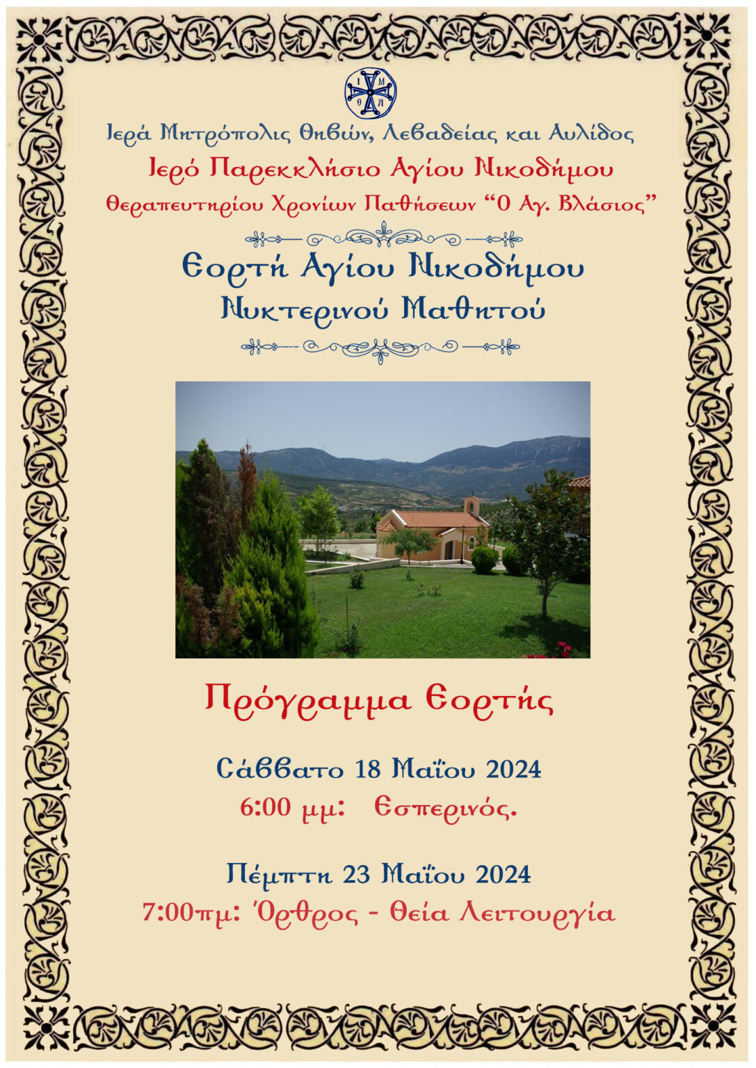 Β͇ο͇ι͇ω͇τ͇ί͇α͇ Εορτή Αγίου Νικοδήμου του Νυκτερινού μαθητού του Χριστού admin 14 Μαΐου, 2024 Tags: Μητροπολίτης Θηβών Post navigation Previous Κυριακή του Θωμά στα ΛουκίσιαNext Σύλληψη στη Χαλκίδα Αφήστε μια απάντηση Ακύρωση απάντησηςΗ ηλ. διεύθυνση σας δεν δημοσιεύεται. Τα υποχρεωτικά πεδία σημειώνονται με *Σχόλιο * Όνομα * Email * Ιστότοπος Αποθήκευσε το όνομά μου, email, και τον ιστότοπο μου σε αυτόν τον πλοηγό για την επόμενη φορά που θα σχολιάσω. Related Stories Πάσχα 2026 Β͇ο͇ι͇ω͇τ͇ί͇α͇ Πάσχα 2026 15 Απριλίου, 2026 Μουλκιώτης:Φιάσκο η πληρωμή των αγροτικών ενισχύσεων της 7ης Απριλίου Β͇ο͇ι͇ω͇τ͇ί͇α͇ Μουλκιώτης:Φιάσκο η πληρωμή των αγροτικών ενισχύσεων της 7ης Απριλίου 15 Απριλίου, 2026 Κατάθεση αιτήσεων από τους αγρότες για τη χρήση του δικτύου άρδευσης Β͇ο͇ι͇ω͇τ͇ί͇α͇ Κατάθεση αιτήσεων από τους αγρότες για τη χρήση του δικτύου άρδευσης 15 Απριλίου, 2026