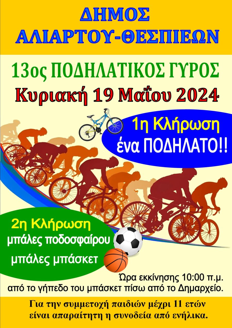 Ο 13ος Ποδηλατικός Γύρος Αλιάρτου, θα πραγματοποιηθεί την προσεχή Κυριακή 19 Μαΐου, στις 10 το πρωί, με αφετηρία το γήπεδο μπάσκετ, πίσω από το Δημαρχείο.