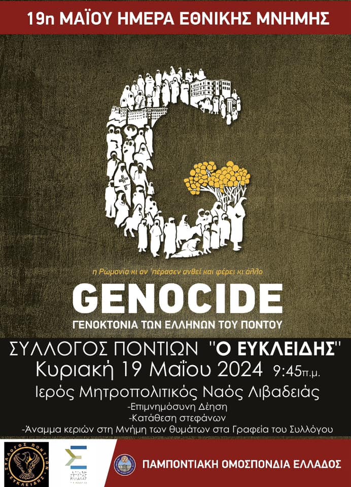 Η Περιφερειακή Ενότητα Βοιωτίας και ο Σύλλογος Ποντίων Βοιωτίας «Ο ΕΥΚΛΕΙΔΗΣ» προσκαλούν την Κυριακή 19 Μαΐου & ώρα 09:45 στον Μητροπολιτικό Ναό Λιβαδειάς, να τιμήσετε με την παρουσία σας την Επέτειο Μνήμης της 19ης Μαΐου για την Γενοκτονία των Ελλήνων του Πόντου.
