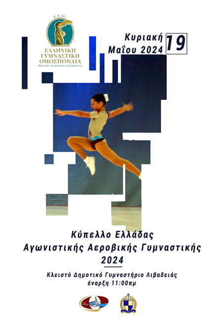 Στο Δημοτικό Κλειστό Γυμναστήριο της Λιβαδειάς, θα διεξαχθούν την Κυριακή 19 Μαΐου 2024, οι αγώνες για το Κύπελλο Ελλάδας Αεροβικής Γυμναστικής Α’ – Β’ – Γ’ – Δ’ κατηγοριών (Ανδρών-Γυναικών, Εφήβων-Νεανίδων, Παίδων-Κορασίδων, Παμπαίδων-Παγκορασίδων), Ε’ Κατηγορίας (προαγωνιστικό) και AEROCOMBO.