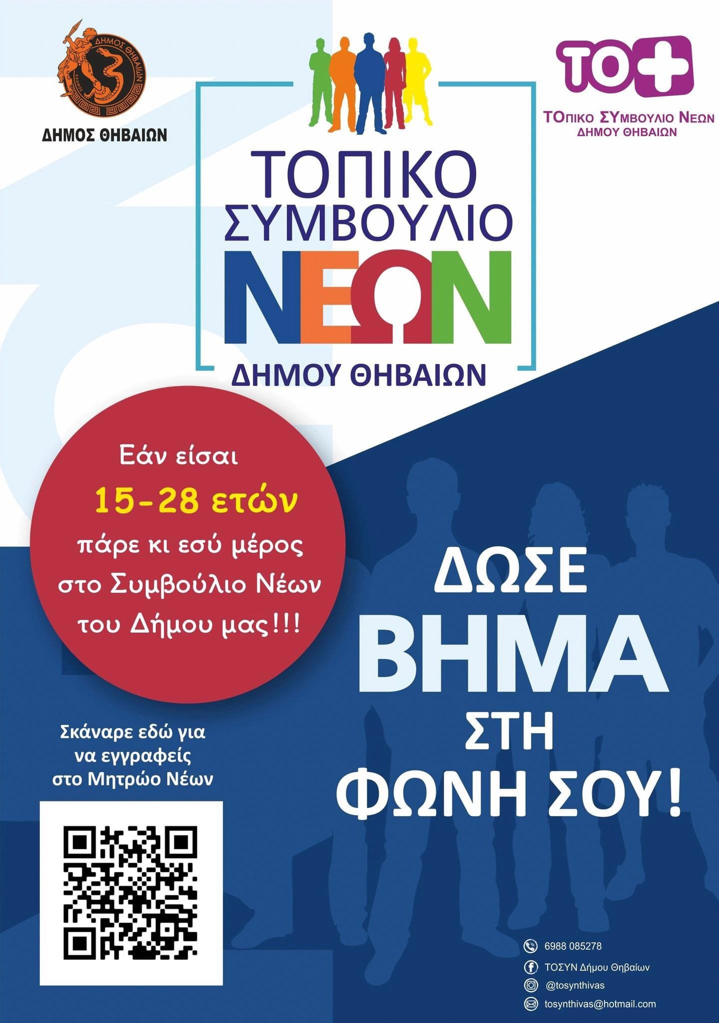Ο Δήμος Θηβαίων στα πλαίσια της προσπάθειας για ενίσχυση της συμμετοχής των νέων στη διαχείριση τοπικών υποθέσεων που ανταποκρίνονται στα ενδιαφέροντά τους, αλλά και την εξοικείωσή τους με τις αρχές της Δημοκρατίας, επιθυμεί να ενισχύσει τη λειτουργία του Τοπικού Συμβουλίου Νέων (ΤΟ.ΣΥ.Ν.).