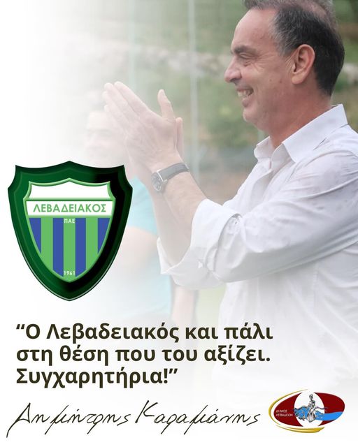 «Ο Λεβαδειακός και πάλι στη θέση που του αξίζει! Θερμά συγχαρητήρια στην Διοίκηση, στο Τεχνικό επιτελείο και στους παίκτες που μετά από ένα απαιτητικό πρωτάθλημα πέτυχαν την επιστροφή της ομάδας της πόλης μας στα σαλόνια της Super League 1. Συγχαρητήρια και στον κόσμο της πόλης που στάθηκε δίπλα στην ομάδα έχοντας ένα και μόνο όνειρο…να δουν και πάλι τον Λεβαδειακό στην ανώτατη κατηγορία.