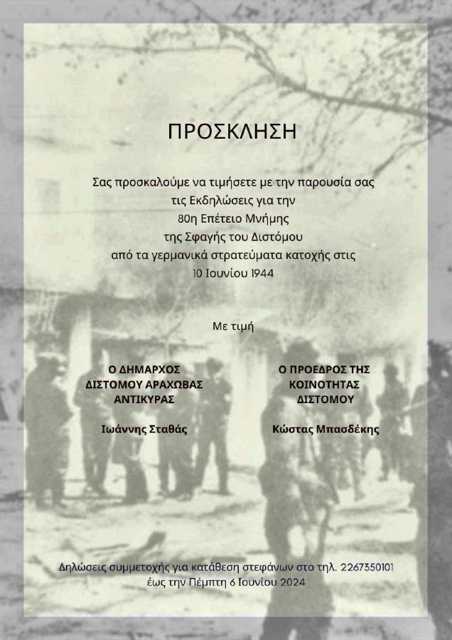 Από την Τετάρτη 29 Μαΐου ξεκινούν, με μια σειρά ποικίλων δραστηριοτήτων πολιτιστικού, επιστημονικού, ιστορικού και αθλητικού περιεχομένου, οι Εκδηλώσεις Τιμής, Μνήμης και Διεκδίκησης για τα 80 ΧΡΟΝΙΑ από τη Σφαγή της Μαρτυρικής Πόλης του Διστόμου που διοργανώνει ο Δήμος Διστόμου, Αράχωβας, Αντίκυρας. Οι εκδηλώσεις, θα κορυφωθούν στις 10 Ιουνίου, που είναι η επέτειος της ναζιστικής θηριωδίας του 1944.