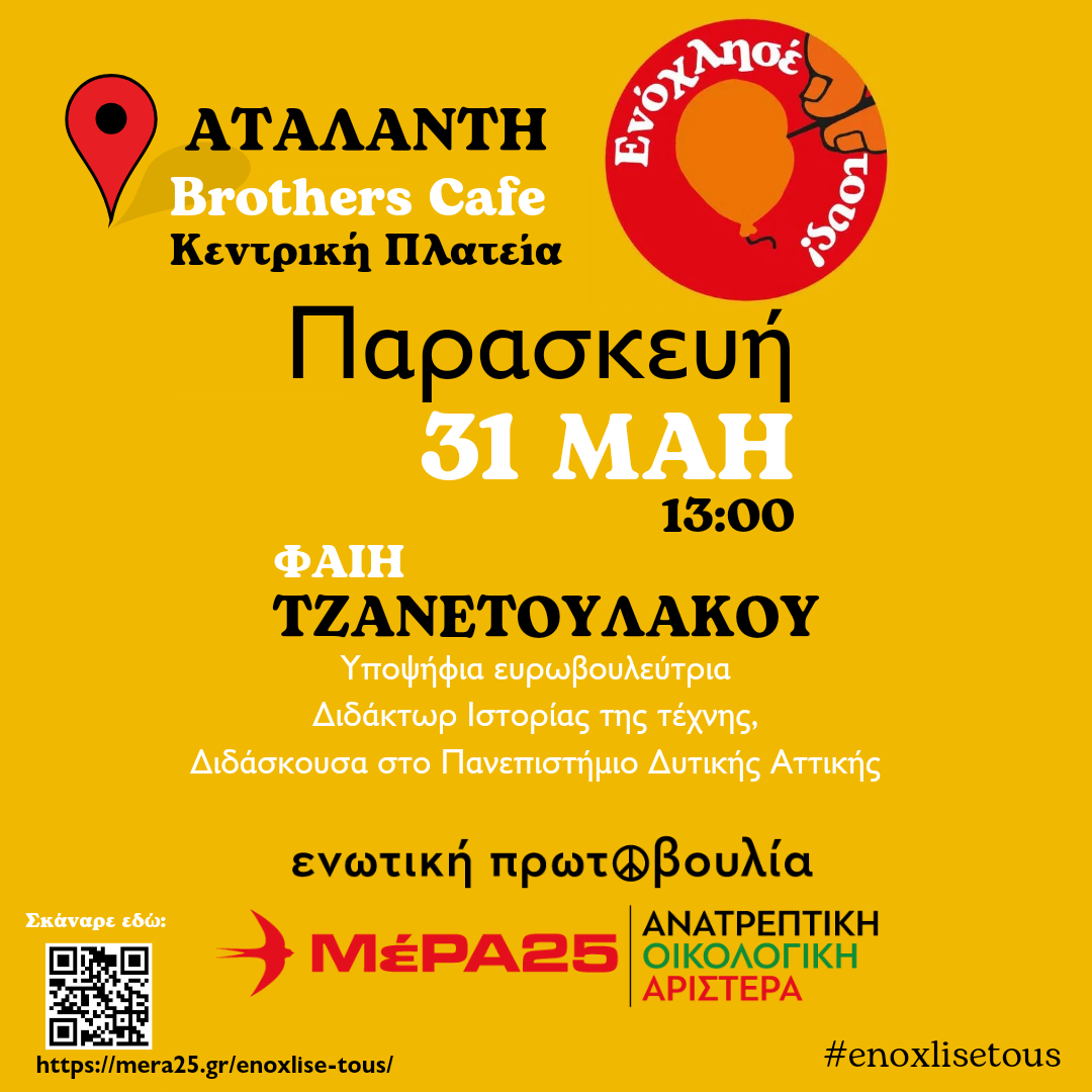 Η υποψήφια Ευρωβουλεύτρια, Διδάκτωρ Ιστορίας της τέχνης, Διδάσκουσα στο Πανεπιστήμιο Δυτικής Αττικής και ακτιβίστρια για το περιβάλλον Φαίη Τζανετουλάκου θα βρεθεί τη Παρασκευή 31 Μάη από το πρωί σε περιοδεία στην Αταλάντη και στις 13:00 θα πραγματοποιήσει συνάντηση συζήτηση με πολίτες της περιοχής στο Brothers cafe στη Κεντρική Πλατεία της πόλης.