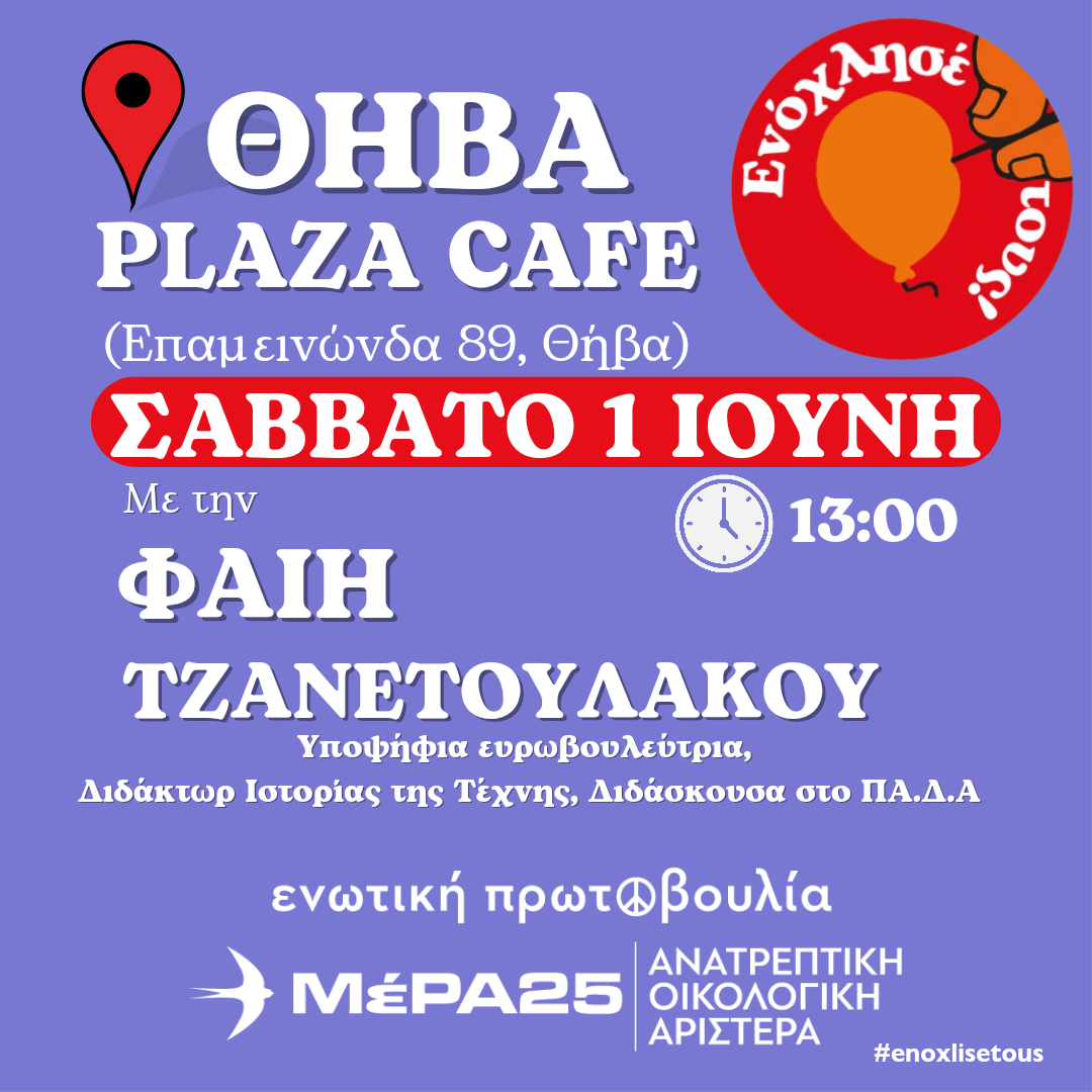 Η υποψήφια Ευρωβουλεύτρια, Διδάκτωρ Ιστορίας της τέχνης, Διδάσκουσα στο Πανεπιστήμιο Δυτικής Αττικής και ακτιβίστρια για το περιβάλλον Φαίη Τζανετουλάκου μαζί με μέλη και στελέχη του ΜέΡΑ25 θα βρεθεί το Σάββατο 1 Ιουνίου στις 10:00 το πρωί σε περιοδεία στον κεντρικό πεζόδρομο της Λιβαδειάς, στις 12:00 θα περιοδεύσει στη λαϊκή αγορά της Θήβας και τα κεντρικά καταστήματα ενώ στις 13:00 στο Plaza Cafe (Επαμεινώνδα 89, Θήβα) θα πραγματοποιήσει ανοιχτή συνάντηση συζήτηση με μέλη του κόμματος και πολίτες της περιοχής για να συζητήσουν για τα τοπικά ζητήματα αλλά και την ευρωπαϊκή πραγματικότητα ενόψει και των Ευρωεκλογών της 9ης Ιούνη.