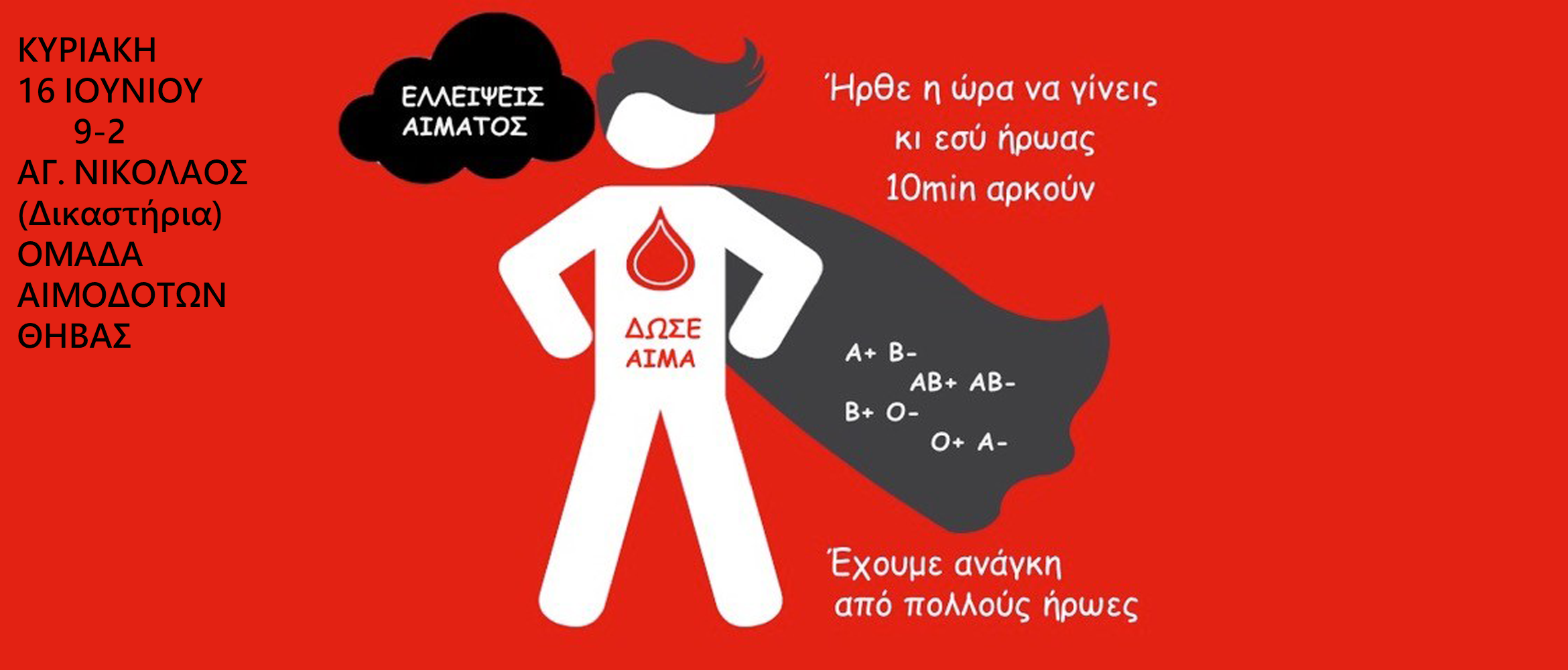 Την Κυριακή 16 Ιουνίου 2024 , από τις 9.00 το πρωί μέχρι τις 2.00 το μεσημέρι , οργανώνεται αιμοδοσία στην αίθουσα τελετών του Ιερού Ναού του Αγίου Νικολάου Θήβας (απέναντι από τα