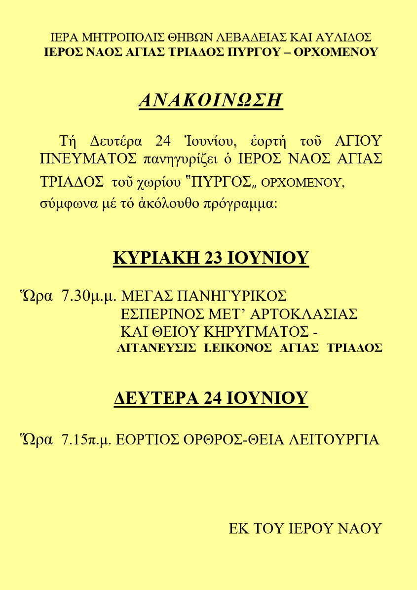 Β͇ο͇ι͇ω͇τ͇ί͇α͇ Πανήγυρη Ιερού Ναού Αγίας Τριάδος Πύργου admin 14 Ιουνίου, 2024 Tags: Mητρόπολη Θηβών Λεβαδείας κ Αυλίδος Μητροπολίτης Θηβών Post navigation Previous Από την Μίδεια στη σύγχρονη ΛιβαδειάNext Συλλήψεις στη Θήβα & σε περιοχές της Στερεάς Αφήστε μια απάντηση Ακύρωση απάντησηςΗ ηλ. διεύθυνση σας δεν δημοσιεύεται. Τα υποχρεωτικά πεδία σημειώνονται με *Σχόλιο * Όνομα * Email * Ιστότοπος Αποθήκευσε το όνομά μου, email, και τον ιστότοπο μου σε αυτόν τον πλοηγό για την επόμενη φορά που θα σχολιάσω. Related Stories Πάσχα 2026 Β͇ο͇ι͇ω͇τ͇ί͇α͇ Πάσχα 2026 15 Απριλίου, 2026 Μουλκιώτης:Φιάσκο η πληρωμή των αγροτικών ενισχύσεων της 7ης Απριλίου Β͇ο͇ι͇ω͇τ͇ί͇α͇ Μουλκιώτης:Φιάσκο η πληρωμή των αγροτικών ενισχύσεων της 7ης Απριλίου 15 Απριλίου, 2026 Κατάθεση αιτήσεων από τους αγρότες για τη χρήση του δικτύου άρδευσης Β͇ο͇ι͇ω͇τ͇ί͇α͇ Κατάθεση αιτήσεων από τους αγρότες για τη χρήση του δικτύου άρδευσης 15 Απριλίου, 2026