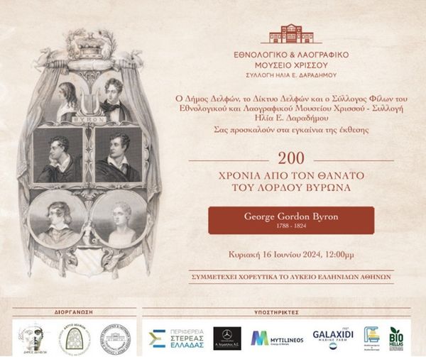 Ο Δήμος Δελφών, το Δίκτυο για τον Πολιτισμό και τον Τουρισμό στη Φωκίδα «Δίκτυο Δελφών» και ο Σύλλογος Φίλων του Εθνολογικού και Λαογραφικού Μουσείου Χρισσού-Συλλογή Ηλία Ε. Δαραδήμου, σας προσκαλούν στα εγκαίνια της έκθεσης «200 χρόνια από το θάνατο του Λόρδου Βύρωνα» (George Gordon Byron 1788-1824), τα οποία θα πραγματοποιηθούν την Κυριακή, 16 Ιουνίου 2024, στις 12:00 το μεσημέρι.