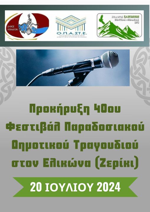Ο Σύλλογος Ελικωνίων Επαρχίας Λιβαδειάς, θα πραγματοποιήσει το 40ο Διαγωνιστικό Φεστιβάλ Παραδοσιακού Δημοτικού Τραγουδιού, στον Ελικώνα (Ζερίκι), στον αύλειο χώρο του Μουσείου Αγροτικής Κληρονομιάς Ελικώνα, στις 20 Ιουλίου, ημέρα Σάββατο και ώρα, 19:00.