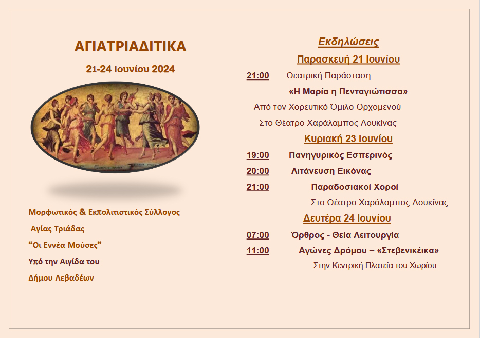Ε͟κ͟δ͟η͟λ͟ώ͟σ͟ε͟ι͟ς͟ ΑΓΙΑΤΡΙΑΔΙΤΙΚΑ admin 17 Ιουνίου, 2024 -ΑΓΙΑΤΡΙΑΔΙΤΙΚΑ 21-24/6, πρόγραμμα εκδηλώσεων: Tags: ΑΓΙΑΤΡΙΔΙΤΙΚΑ Λιβαδειά Post navigation Previous Επεμβάσεις αποκατάστασης & ανάδειξης των Ανατολικών Θερμών, στους ΔελφούςNext Στο υπουργείο Εργασίας αντιπροσωπεία της ΛΑΡΚΟ Αφήστε μια απάντηση Ακύρωση απάντησηςΗ ηλ. διεύθυνση σας δεν δημοσιεύεται. Τα υποχρεωτικά πεδία σημειώνονται με *Σχόλιο * Όνομα * Email * Ιστότοπος Αποθήκευσε το όνομά μου, email, και τον ιστότοπο μου σε αυτόν τον πλοηγό για την επόμενη φορά που θα σχολιάσω. Related Stories Δράση πρόληψης και προαγωγής υγείας στη Δωρίδα με τους «Γιατρούς του Κόσμου» Ε͟κ͟δ͟η͟λ͟ώ͟σ͟ε͟ι͟ς͟ Δράση πρόληψης και προαγωγής υγείας στη Δωρίδα με τους «Γιατρούς του Κόσμου» 16 Απριλίου, 2026 Ο Όμιλος Φίλων Θεάτρου Λιβαδειάς ανεβάζει την παράσταση “Εχθροί εξ Αίματος” του Αρκά Ε͟κ͟δ͟η͟λ͟ώ͟σ͟ε͟ι͟ς͟ Ο Όμιλος Φίλων Θεάτρου Λιβαδειάς ανεβάζει την παράσταση “Εχθροί εξ Αίματος” του Αρκά 15 Απριλίου, 2026 Ο Πολιτιστικός Σύλλογος Αρκίτσας ” Ο Κλείδωνας” αναβίωσε το έθιμο της «Ρωμάνας» Ε͟κ͟δ͟η͟λ͟ώ͟σ͟ε͟ι͟ς͟ Ο Πολιτιστικός Σύλλογος Αρκίτσας ” Ο Κλείδωνας” αναβίωσε το έθιμο της «Ρωμάνας» 14 Απριλίου, 2026