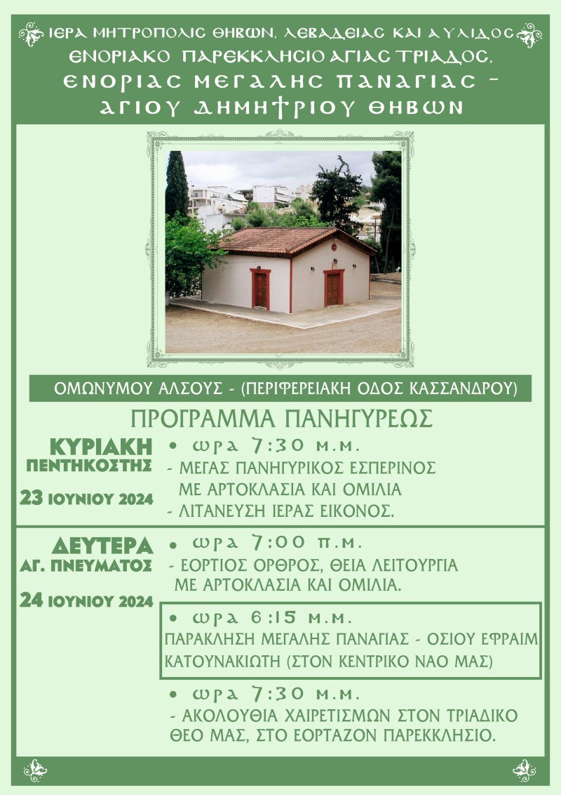 Θ͟͞ή͟͞β͟͞α͟͞ Πανήγυρις Παρεκκλησίου Αγίας Τριάδος Ενορίας Μ.Παναγίας Θηβών admin 19 Ιουνίου, 2024 Tags: Mεγάλη Παναγία Θηβών Μητροπολίτης Θηβών Post navigation Previous Κυριακή Ζ΄ από του ΠάσχαNext Κήρυξη 24ωρης Πανεπαρχιακής Απεργίας Αφήστε μια απάντηση Ακύρωση απάντησηςΗ ηλ. διεύθυνση σας δεν δημοσιεύεται. Τα υποχρεωτικά πεδία σημειώνονται με *Σχόλιο * Όνομα * Email * Ιστότοπος Αποθήκευσε το όνομά μου, email, και τον ιστότοπο μου σε αυτόν τον πλοηγό για την επόμενη φορά που θα σχολιάσω. Related Stories Διακοπή ρεύματος στη Θήβα & σε χωριά Θ͟͞ή͟͞β͟͞α͟͞ Διακοπή ρεύματος στη Θήβα & σε χωριά 15 Απριλίου, 2026 Σύγκληση ΤΕΣΟΠ στο Γραφείο Δημάρχου του Δήμου Θηβαίων Θ͟͞ή͟͞β͟͞α͟͞ Σύγκληση ΤΕΣΟΠ στο Γραφείο Δημάρχου του Δήμου Θηβαίων 15 Απριλίου, 2026 📢📣 Κυκλοφοριακές ρυθμίσεις για την εκτέλεση εργασιών του έργου «Αποκαταστάσεις ζημιών από φυσικές καταστροφές» Θ͟͞ή͟͞β͟͞α͟͞ 📢📣 Κυκλοφοριακές ρυθμίσεις για την εκτέλεση εργασιών του έργου «Αποκαταστάσεις ζημιών από φυσικές καταστροφές» 15 Απριλίου, 2026