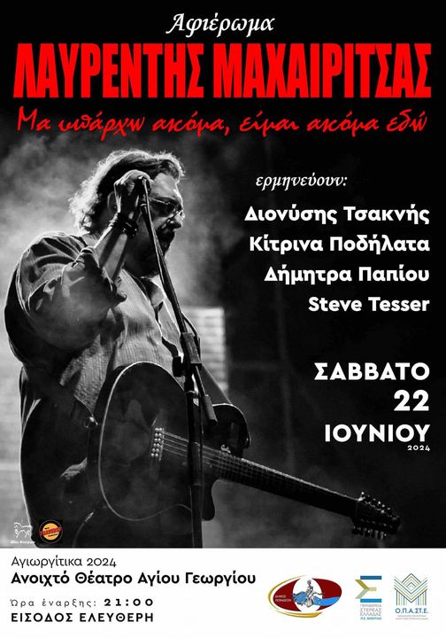 Η μεγάλη βραδιά πλησιάζει! Αφιέρωμα στον Λαυρέντη Μαχαιρίτσα το Σάββατο 22 Ιουνίου, στα πλαίσια των εκδηλώσεων «ΑϊΓιωργίτικα 2024»…με τους Διονύση Τσακνή, Κίτρινα Ποδήλατα, Δήμητρα Παπίου και Steve Tesser.