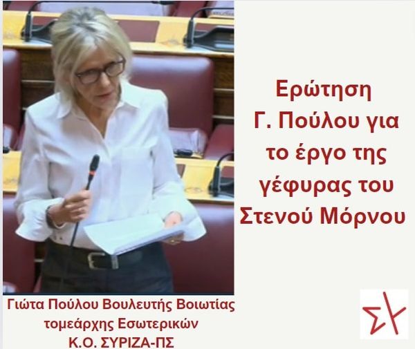 Σε ερώτηση που κατέθεσα μαζί με άλλους βουλευτές του ΣΥΡΙΖΑ-ΠΣ και απευθύνεται στον Υπουργό Υποδομών, επαναφέρουμε το «ξεχασμένο» ζήτημα της κατασκευής της νέας γέφυρας του Στενού Μόρνου, ζητώντας, αφενός, ενημέρωση για το εάν έχουν αποπερατωθεί οι σχετικές μελέτες του έργου και, αφετέρου, αν προτίθεται να αναλάβει πρωτοβουλίες, ώστε να υλοποιηθεί.