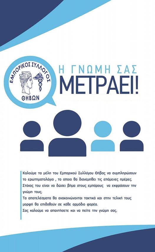 Καλούμε τα μέλη του Εμπορικού Συλλόγου Θήβας να συμπληρώσουν το ερωτηματολόγιο , το οποιο θα διανεμηθει τις επόμενες ημέρες.