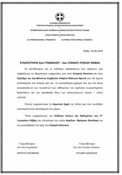 Επιτέλους ένα χρόνιο πρόβλημα του Σχολικου Συγκροτήματος Καστελλίων επιλύθηκε με την ευγενική χορηγία της εταιρείας Ravenna με Πρόεδρο τον κύριο Βρεττό και της Δημοτικής Αρχής του Δήμου Θηβαίων.