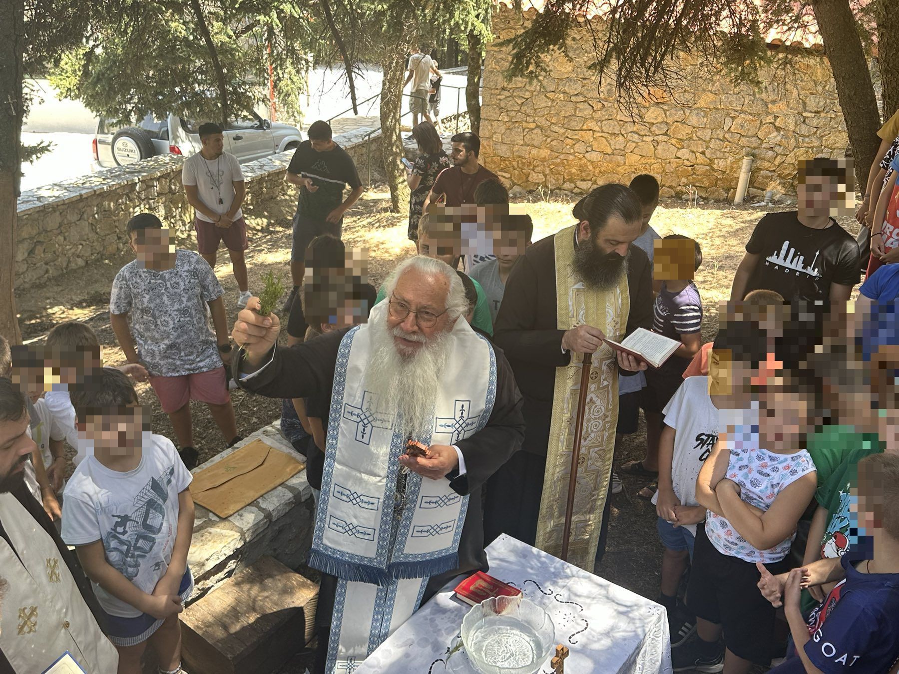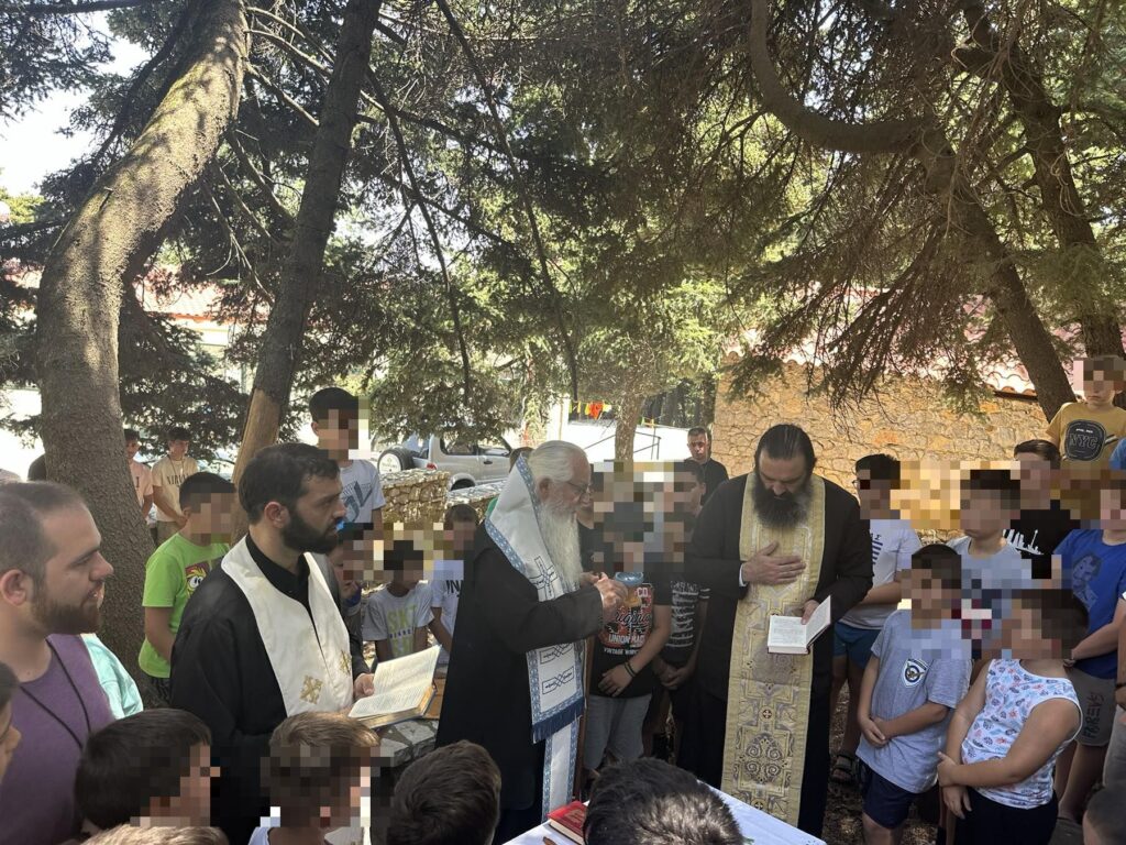 Κοντά στα παιδιά από την πρώτη μέρα βρίσκεται ο Σεβασμιώτατος Ποιμενάρχης μας κ. Γεώργιος, ο οποίος το μεσημέρι τέλεσε τον Αγιασμό της πρώτης κατασκηνωτικής περιόδου. Ο Σεβασμιώτατος καλωσόρισε τα παιδιά και τους ανέφερε ότι στην Κατασκήνωση θα έχουν την ευκαιρία να γνωρίσουν νέους φίλους, θα μάθουν να ζουν μαζί με άλλα παιδιά, θα ζήσουν κοντά στη φύση και θα γνωρίσουν τη ζωή της Εκκλησίας και τους ευχήθηκε να έχουν καλή διαμονή.