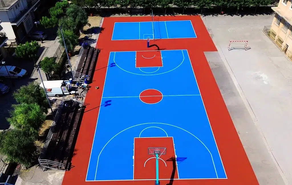 Σύμφωνα με τη μελέτη, έγινε ασφαλτόστρωση τμήματος του προαυλίου και ακολούθως επίστρωση ελαστικού τάπητα για τη διαμόρφωση των γηπέδων, μπάσκετ και βόλεϊ, σύμφωνα με τις προδιαγραφές που προβλέπονται από τη Γενική Γραμματεία Αθλητισμού. Επίσης, τοποθετήθηκαν δύο νέες μπασκέτες, πυλώνες φωτισμού του χώρου, μεταλλικές σταθερές κερκίδες, παγκάκια και νέα βρύσες.