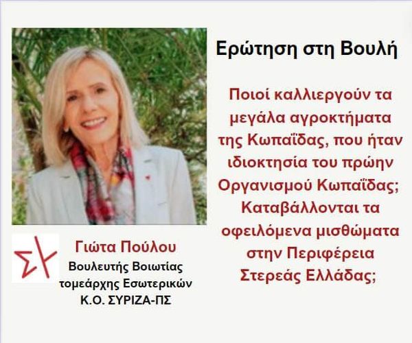 Με Ερώτηση και Αίτηση Κατάθεσης Εγγράφων που κατέθεσα στη Βουλή και συνυπογράφουν ακόμη έξι βουλευτές του ΣΥΡΙΖΑ-ΠΣ, απευθύνεται στον υπουργό Εσωτερικών και αναδεικνύουμε τις καταγγελίες πολλών αγροτών για το «θολό» καθεστώς των ενοικιαζόμενων αγροκτημάτων της Κωπαΐδας. Συγκεκριμένα, δεν υπάρχει διαφάνεια στη διαδικασία μίσθωσης αλλά και στην απόδοση των μισθωμάτων των αγροκτημάτων μεγάλων εκτάσεων που ανήκαν στην ιδιοκτησία του πρώην Οργανισμού Κωπαΐδας και πλέον, από το 2015, διαχειρίζεται η Περιφέρεια Στερεάς Ελλάδας ως καθολικός διάδοχος του Οργανισμού Κωπαΐδας.