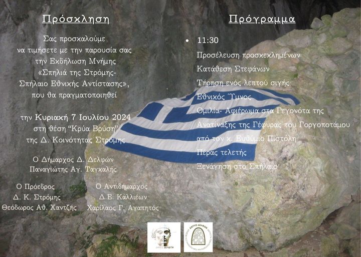 Ο Δήμος Δελφών, η Δημοτική Ενότητα Καλλιέων και η Δημοτική Κοινότητα Στρόμης προσκαλούν στην Εκδήλωση Μνήμης «Σπηλιά της Στρόμης- Σπήλαιο Εθνικής Αντίστασης», η οποία θα πραγματοποιηθεί την Κυριακή 7 Ιουλίου 2024, στις 11:30, στη θέση «Κρύα Βρύση».