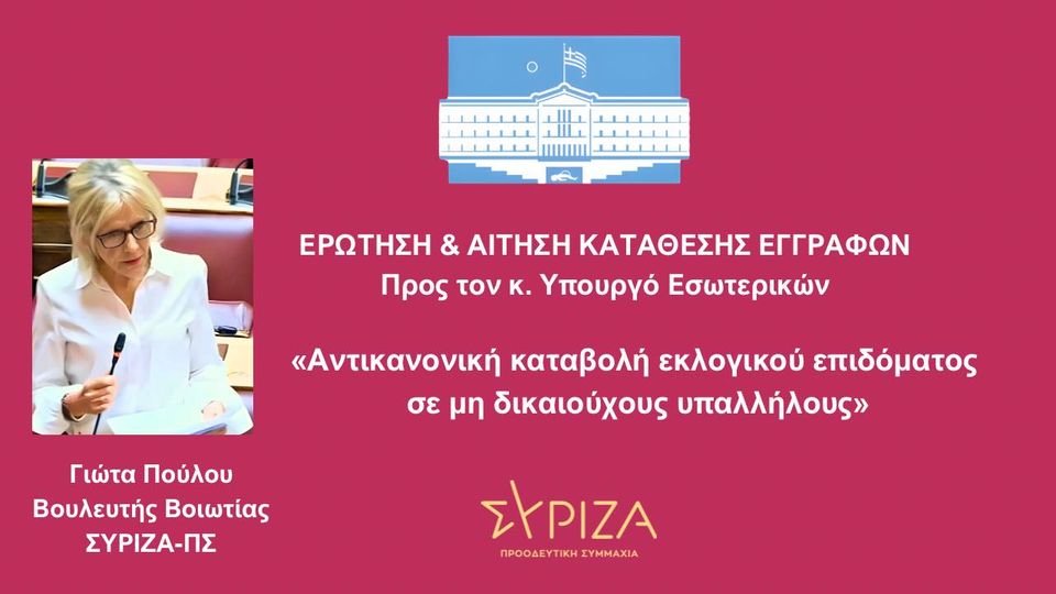 Με Ερώτηση και Αίτηση Κατάθεσης Εγγράφων (ΑΚΕ) που κατέθεσα στη Βουλή μαζί με άλλους βουλευτές του ΣΥΡΙΖΑ-ΠΣ και απευθύνεται στον υπουργό Εσωτερικών αναδεικνύω το πολύ σοβαρό ζήτημα που έχει προκύψει με την καταγγελλόμενη από τους εργαζομένους του Υπουργείου Εσωτερικών μεθόδευση καταβολής του ενισχυμένου εκλογικού επιδόματος ύψους 3.500 ευρώ σε σαράντα υπαλλήλους, χωρίς να πληρούνται οι νόμιμες προϋποθέσεις.