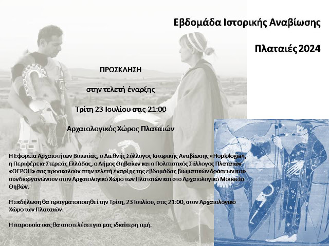 Η Εφορεία Αρχαιοτήτων Βοιωτίας, ο Διεθνής Σύλλογος Ιστορικής Αναβίωσης «Hoplologia», η Περιφέρεια Στερεάς Ελλάδας, ο Δήμος Θηβαίων και ο Πολιτιστικός Σύλλογος Πλαταιών «ΩΕΡΟΗ» σας προσκαλούν στην εβδομάδα βιωματικών δράσεων που συνδιοργανώνουν στον Αρχαιολογικό Χώρο των Πλαταιών και στο Αρχαιολογικό Μουσείο Θηβών.