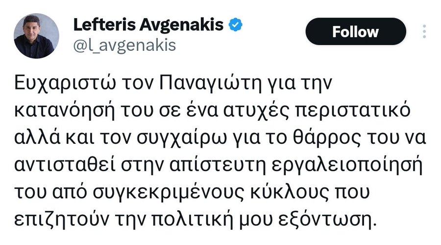 Το 𝓈𝓁𝑜𝑔𝒶𝓃 #Toslogan admin 18 Ιουλίου, 2024 Ζω στη Χώρα που όλοι καταλαβαίνουμε γιατί απέσυρε τη μήνυση ο Παναγιώτης. Ο μόνος που πιστεύει ότι δεν το καταλαβαίνουμε είναι ο #Αυγενάκης. Tags: To slogan Post navigation Previous #τοσκίτσοNext Ο Πλούτος του Αριστοφάνη στο αρχαίο θέατρο του Καβειρίου Θηβών Αφήστε μια απάντηση Ακύρωση απάντησηςΗ ηλ. διεύθυνση σας δεν δημοσιεύεται. Τα υποχρεωτικά πεδία σημειώνονται με *Σχόλιο * Όνομα * Email * Ιστότοπος Αποθήκευσε το όνομά μου, email, και τον ιστότοπο μου σε αυτόν τον πλοηγό για την επόμενη φορά που θα σχολιάσω. Related Stories #οSlogan Το 𝓈𝓁𝑜𝑔𝒶𝓃 #οSlogan 16 Απριλίου, 2026 #oSlogan Το 𝓈𝓁𝑜𝑔𝒶𝓃 #oSlogan 15 Απριλίου, 2026 #οSlogan Το 𝓈𝓁𝑜𝑔𝒶𝓃 #οSlogan 14 Απριλίου, 2026