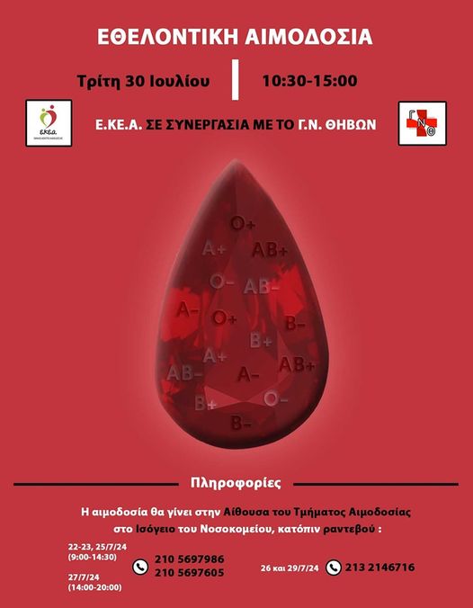 Το Γ.Ν Θηβών σε συνεργασία με το ΕΚΕΑ (εθνικό κέντρο αιμοδοσίας) οργανώνει αιμοδοσία στον χωρο του νοσοκομειου κατοπιν ραντεβού, την Τριτη 30 Ιουλίου 2024 από τις 10:30 το πρωι έως τις 15:00 το μεσημέρι.