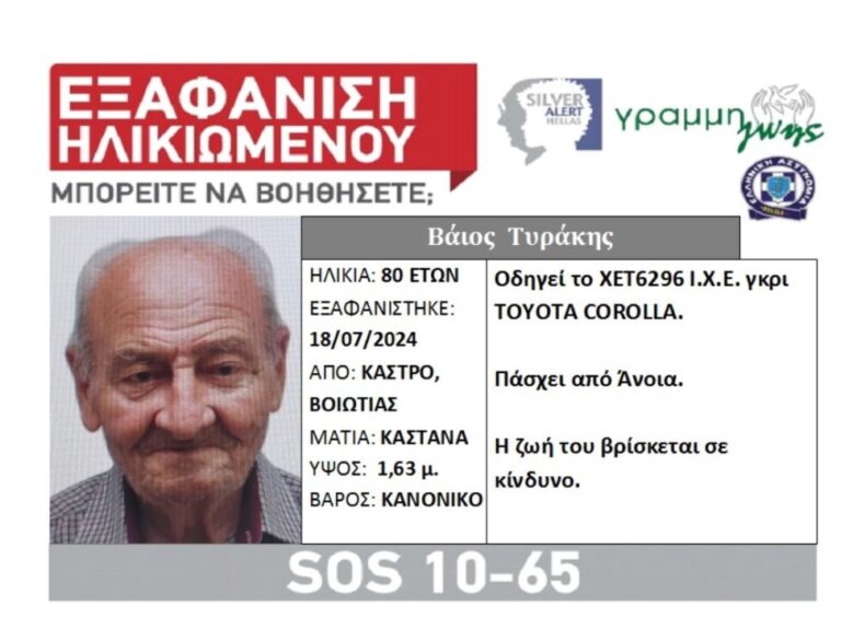 Ο 80χρονος Βάιος Τυράκης εξαφανίστηκε το μεσημέρι της 18ης Ιουλίου 2024, στην περιοχή του Κάστρου Βοιωτίας.