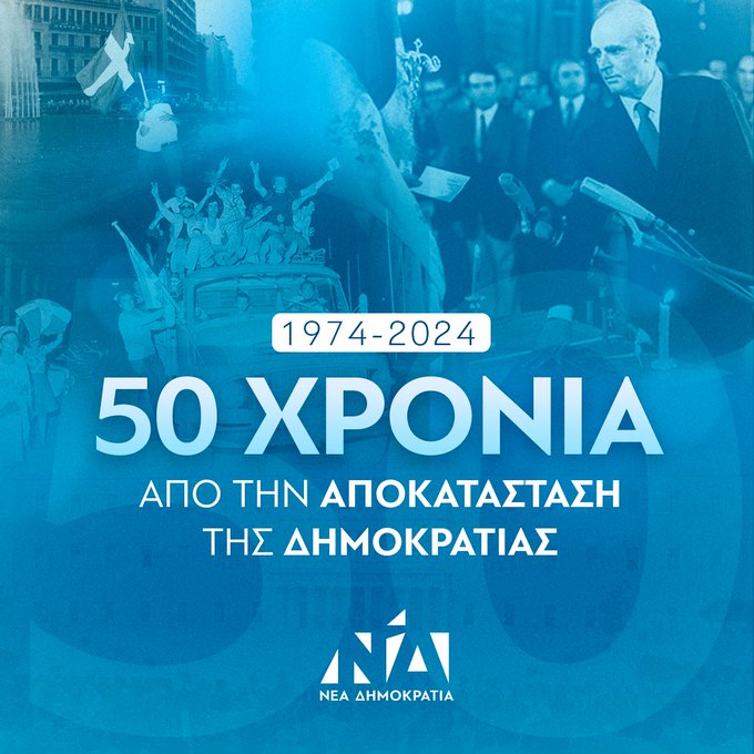 Συμπληρώνονται σήμερα 50 χρόνια από την ιστορική 24η Ιουλίου 1974. 50 χρόνια από την αποκατάσταση της Δημοκρατίας στον τόπο που τη γέννησε. Υποδεχόμαστε τη σημερινή επέτειο με υπερηφάνεια και συγκίνηση. Και με το καθήκον να υπηρετούμε τη Δημοκρατία αδιαπραγμάτευτα.