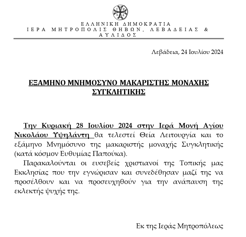Β͇ο͇ι͇ω͇τ͇ί͇α͇ Εξάμηνο Μνημόσυνο μακαριστής μοναχής Συγκλητικής admin 24 Ιουλίου, 2024 Tags: Iερά Μητρόπολη Θηβών Λεβαδείας κ Αυλίδος Μητροπολίτης Θηβών Post navigation Previous Εορτή Προφήτη ΗλίαNext Σοβαρό εργατικό «ατύχημα» στην ΤΕΡΝΑ Λευκόλιθοι Αφήστε μια απάντηση Ακύρωση απάντησηςΗ ηλ. διεύθυνση σας δεν δημοσιεύεται. Τα υποχρεωτικά πεδία σημειώνονται με *Σχόλιο * Όνομα * Email * Ιστότοπος Αποθήκευσε το όνομά μου, email, και τον ιστότοπο μου σε αυτόν τον πλοηγό για την επόμενη φορά που θα σχολιάσω. Related Stories Πάσχα 2026 Β͇ο͇ι͇ω͇τ͇ί͇α͇ Πάσχα 2026 15 Απριλίου, 2026 Μουλκιώτης:Φιάσκο η πληρωμή των αγροτικών ενισχύσεων της 7ης Απριλίου Β͇ο͇ι͇ω͇τ͇ί͇α͇ Μουλκιώτης:Φιάσκο η πληρωμή των αγροτικών ενισχύσεων της 7ης Απριλίου 15 Απριλίου, 2026 Κατάθεση αιτήσεων από τους αγρότες για τη χρήση του δικτύου άρδευσης Β͇ο͇ι͇ω͇τ͇ί͇α͇ Κατάθεση αιτήσεων από τους αγρότες για τη χρήση του δικτύου άρδευσης 15 Απριλίου, 2026