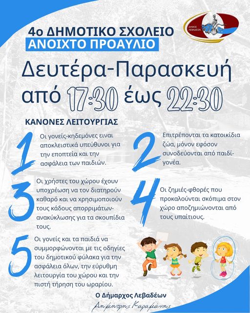 Με απόφαση Δημάρχου, για το χρονικό διάστημα από 29 Ιουλίου 2024 μέχρι 10 Σεπτεμβρίου 2024 το προαύλιο του 4ου Δημοτικού Σχολείου Λιβαδειάς θα ανοίγει όλες τις καθημερινές (Δευτέρα έως Παρασκευή) από τις 17.30 το απόγευμα μέχρι τις 10.30 το βράδυ, με φύλακα, ώστε να υποδέχεται τα παιδιά που θέλουν να παίξουν και να δημιουργηθεί ένας χώρος συνάντησης για τους μαθητές και τους κατοίκους της κάθε γειτονιάς.