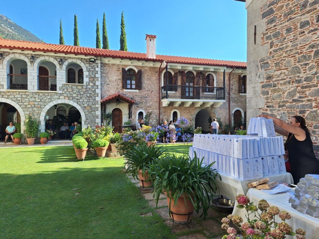 Στο τέλος σε όλους προσφέρθηκε μοναστηριακή δοχή στην αυλή του Μοναστηριού για την ανάπαυση της ψυχής του μακαριστού ιερέα.