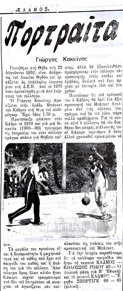 Ο Γιώργος Κοκκίνης γεννήθηκε στις 23.08.1952 και έφυγε από κοντά μας στις 2.8.2022. Αποτέλεσε μια σημαντική προσωπικότητα στο χώρο του αθλητισμού και ειδικότερα του μπάσκετ, τόσο ως αθλητής και κυρίως ως προπονητής. Συνέδεσε το όνομα του με τις μεγαλύτερες επιτυχίες του Κάδμου Θηβών και του Θηβαϊκού μπάσκετ. Από το 1970 έως το 1984 αγωνίστηκε ως αθλητής του μπάσκετ στον Κάδμο, ενώ ταυτόχρονα ήταν προπονητής των υποδομών του Κάδμου. Από τα τέλη της δεκαετίας του 1970 βρέθηκε στο Βελιγράδι, με την βοήθεια του Κάδμου και παρακολούθησε το προπονητικό πλάνο του Ερυθρού Αστέρα, και στη συνέχεια ακολούθησε την προπονητική καριέρα. Ως πρώτος προπονητής του Κάδμου στην Β’ Εθνική (αντίστοιχης της σημερινής Α2 Εθνικής κατηγορίας) με την πλήρη στήριξη της διοίκησης του Κάδμου και του αείμνηστου προέδρου του Ανδρέα Ερρίκου Χατζόπουλου, ήταν πρωταγωνιστής με την ομάδα του Κάδμου στο αντίστοιχο πρωτάθλημα. Επίσης πολλά χρόνια ήταν προπονητής και στην Γ’ Εθνική και σε ομάδες της ΕΣΚΑΣΕ με πολύ μεγάλες επιτυχίες. Κόσμησε τα γήπεδα της περιφέρειας Στερεάς Ελλάδας και όλης της Ελλάδας, ως προπονητής τόσο στη Θήβα, την Άμφισσα, τη Χαλκίδα, το Σχηματάρι κλπ, με όλους τους ανθρώπους που συνεργάστηκε να έχουν τις καλύτερες αναμνήσεις και εικόνες από την συνεργασία τους μαζί του. Έδωσε σημαντικό χρόνο και μεγάλη συμμετοχή στο γήπεδο στα νέα παιδιά προωθώντας και βοηθώντας τους νέους αθλητές να γίνουν καλύτεροι. Ανέδειξε πολλούς καλούς παίκτες, που κατάφεραν να αγωνιστούν σε μεγάλες ομάδες. Πραγματικά ήταν τυχεροί όσοι αθλητές εργάστηκαν μαζί του στο γήπεδο. Κατάφερε να έχει παντού φίλους, εκτίμηση και αναγνώριση. Ο Γ. Κοκκίνης ήταν υπόδειγμα ανιδιοτέλειας και ντομπροσύνης. Μια σπουδαία και εμβληματική μπασκετική ευφυΐα. Κατακεραύνωσε τα κακώς κείμενα των σκοπιμοτήτων, των καιροσκόπων και των κερδοσκόπων του αθλητισμού, με τον αυθορμητισμό του και την ευθύτητα του.